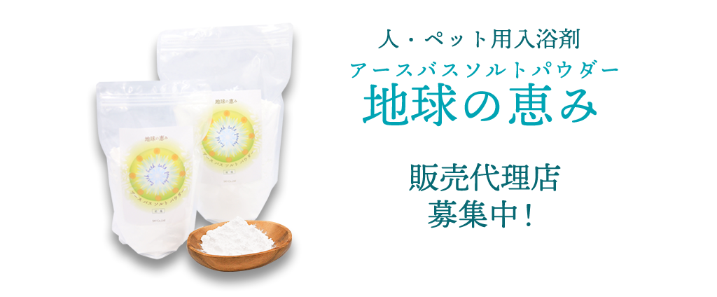アースバスソルトパウダー「地球の恵み」は、全国の美容サロン・健康サロン・動物病院・ペットショップ等で販売されております。代理店加盟料0円、販売数量のしばりもありません。